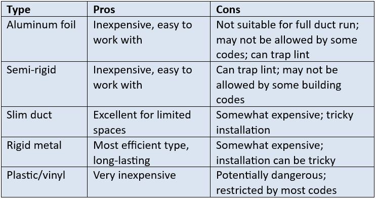 Aluminum foil duct is inexpensive and easy to work with, but its ribbed walls can trap lint, leading to a possible fire hazard and therefore should be used in short segments that remain accessible for regular cleaning.